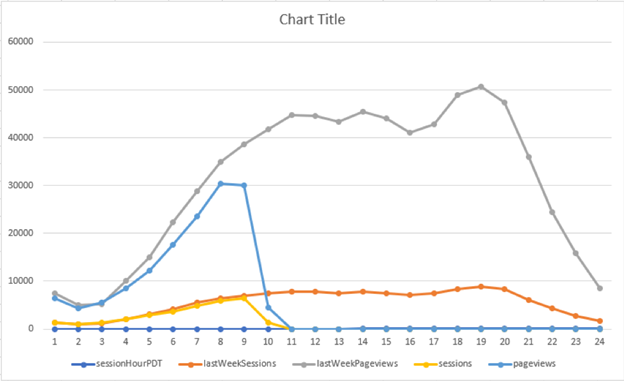 - Another retailer was interested in building a dashboard showing key measurements, such as number of sessions, pageviews, and transactions, by the hour on a live dashboard, to monitor the site performance.